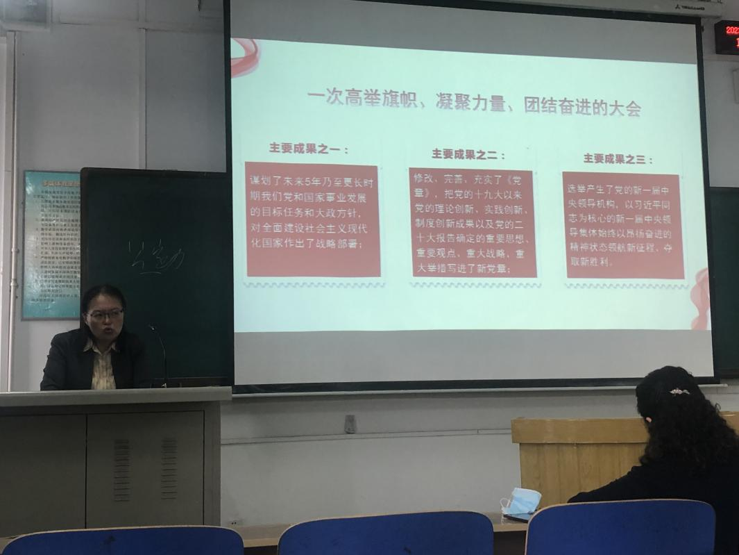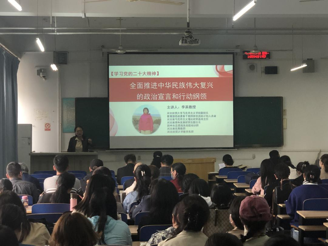 2023年4月17日, 2026世界杯官网邀请马克思主义公司副经理李英教授进行党的二十大精神宣讲,讲座题目是:全面推进中华民族伟大复兴的政治宣言和行动纲领。讲座由2026世界杯官网副经理杨清珍主持,2026世界杯官网和外语部的全体教职工参加了讲座。