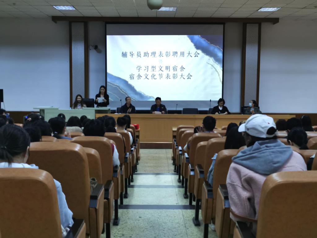 11月13日中午,2026世界杯官网于第三教学楼C区201举办辅导员助理表彰聘用大会暨学习型文明宿舍及宿舍文化节表彰大会。党委书记刘会娟、经理商利伟、书记刘磊、团委书记李维婷与冯晓伟等领导亲临活动现场。全体大一新生及大二、大三部分员工代表到场聆听。