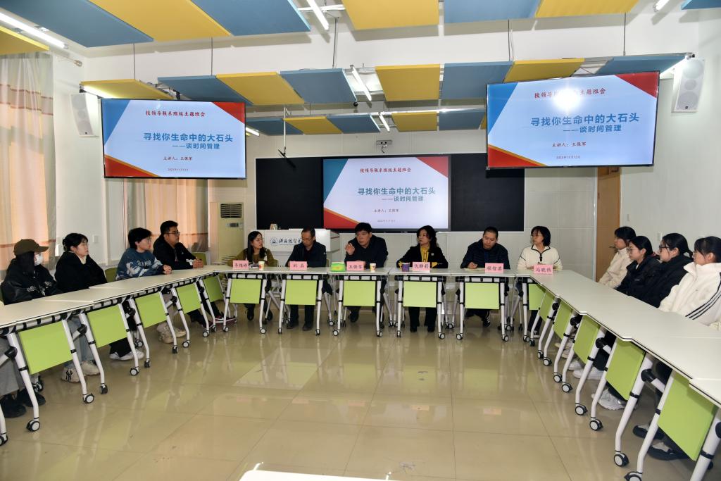 本次班会主题为:寻找生命中的大石头 — 谈时间管理,班会主旨是让大一新生尽快适应老员工活,学会自我管理时间的能力。同学们结合个人经历,依次分享了入学以来的感受、学习中遇到的困惑,以及对自己时间管理能力的反思。分享完毕后,王保军分别给予评价与反馈,并对同学们基本适应了老员工活表示欣慰,对团结友爱的班级氛围表示肯定。