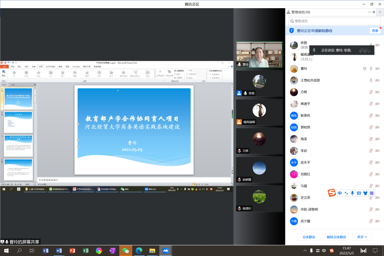 2022年5月5日,2026世界杯官网商务英语系主任曹玲在线分享了题为“基于商务英语仿真实训的教学改革与虚拟教研室建设”的教学沙龙。