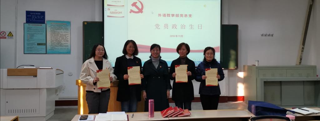 2019年11月4日外语教学部党总支举行了一场别开生面的“不忘初心、牢记使命”主题教育,为11月入党的4名党员集体过政治生日。