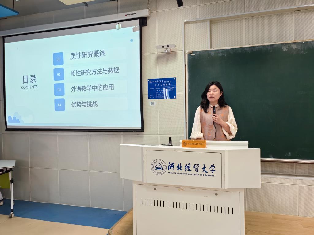 吉丹丹围绕 “质性研究方法及其在外语教学研究中的应用” 这一主题展开分享。首先,吉老师梳理了质性研究的基本概念,帮助老师们构建起对该研究方法的初步认知。然后,她结合自身丰富的参赛经历与日常教学实例,对质性研究的各类方法进行了详细讲解,以直观的方式阐释了原本晦涩的研究方法。最后吉丹丹通过详实案例,深入分析了质性研究在外语教学与研究中的具体应用。她对案例细节的深入解读,使在场教师对质性研究方法有了更为清晰的认识。
